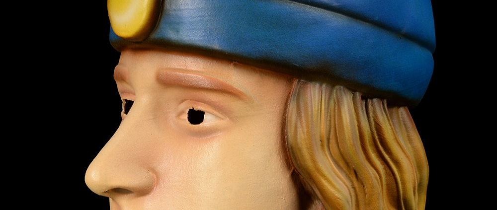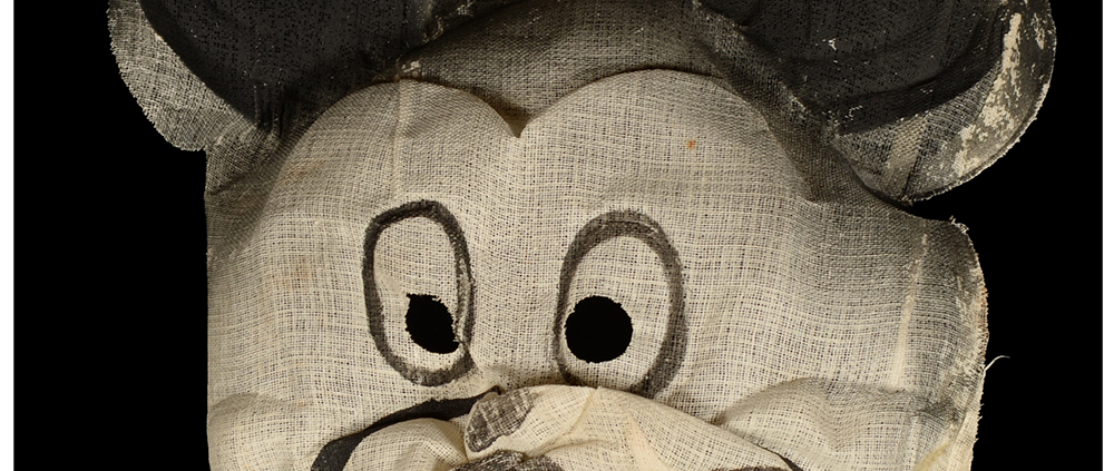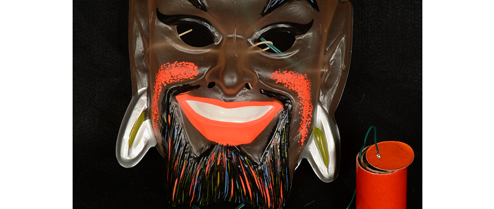 This specific mask was mass produced by a process known as vacuform molding. Sheets of heated styrene plastic are placed over a three-dimensional mold and a vacuum sucks out the air, forming the plastic to the mold. The mask is then cut out, machine painted, and an elastic band is stapled to the mask. The process is exceedingly fast and inexpensive, making the mask very popular with the overwhelming majority of Americans from the late 1950s to today.