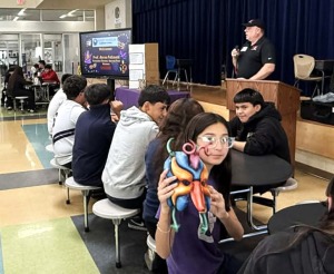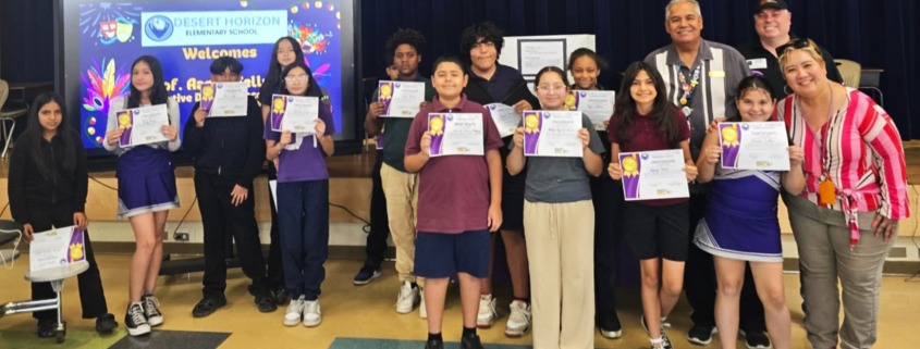 At the invitation of sixth-grade teacher Divina Gracia Agoncillo, the Executive Director visited Desert Horizon Elementary School last week to observe the award ceremony for the 6th grade class, which had completed an art project involving making and painting face masks. While there, Prof. Fellmeth passed around five masks from different continents for the students to inspect and handle, and he made some brief comments on the meaning of masquerade.